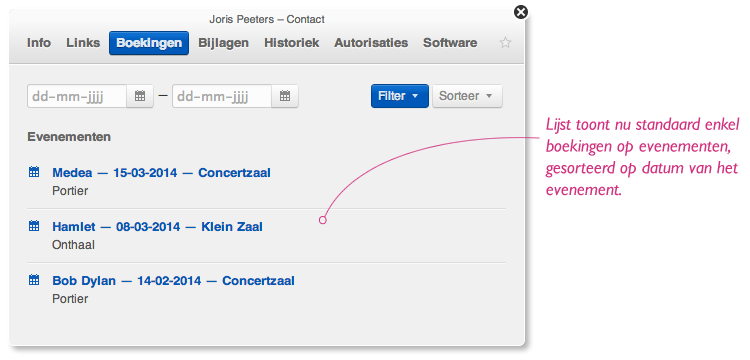 Bij het openen van het boekingen tabblad van een contact toont de lijst nu standaard enkel boekingen op een evenement van dat contact. De boekingen staan ook standaard gesorteerd op de datum van het evenement (nieuwste bovenaan), en niet langer op de boekingsdatum van het contact op dat evenement.