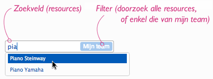 In de zoekvelden om contacten of resources toe te voegen is een filter toegevoegd. Dit laat toe om álle elementen te doorzoeken, of énkel die van je eigen (primair) team.