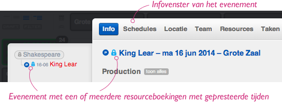 Indien een evenement resourceboekingen heeft waarop gepresteerde tijden ingevuld zijn, dan kan je het evenement niet meer veranderen van datum of locatie, en kan je de naam niet wijzigen. Je kan het evenement dan ook niet meer verwijderen. Als je de datum, locatie of naam van zo’n evenement wilt wijzigen kan dit enkel door eerst de gepresteerde tijden terug te verwijderen.