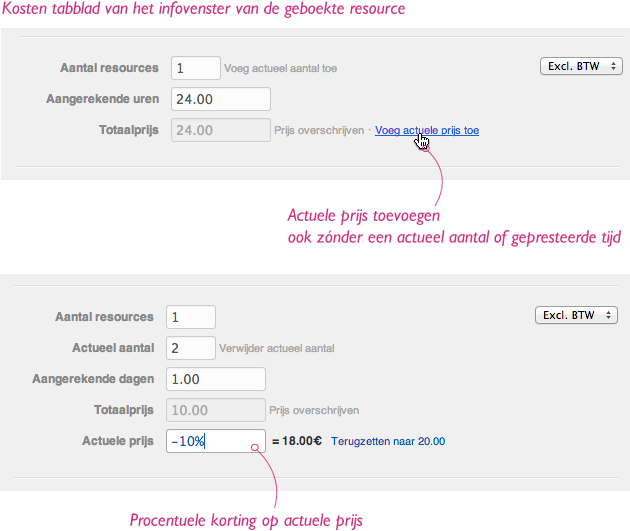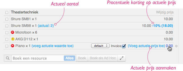 Standaard is de actuele prijs gelijk aan de geplande prijs. Voeg je echter een actueel aantal toe dan zal de actuele prijs deze wijziging in rekening brengen (bijvoorbeeld: er was één microfoon gepland maar er zijn er uiteindelijk twee gebruikt). Ook als je een afwijkende gepresteerde tijd toevoegt aan een resource zal de actuele prijs hieraan aangepast worden (bijvoorbeeld: Jan was gepland van 14:00 tot 18:00 maar heeft gewerkt van 14:00 tot 19:00).