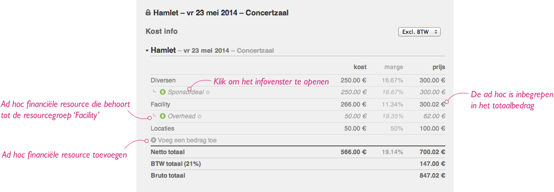 Op het kost info tabblad van het infovenster van het evenement wordt een ad hoc financiële resource nu opgeteld bij het totaal van de resourcegroep waartoe hij behoort. De ad hoc financiële resource wordt hier ook nog steeds apart opgesomd, als onderdeel van de desbetreffende resourcegroep.