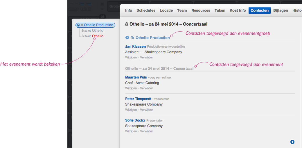 Contacten die je toegoegt via het tabblad “Contacten” van het infovenster van een evenement hebben een verbeterde weergave gekregen. Het is nu duidelijk of een contact toegevoegd is aan een evenementgroep, of aan het evenement zelf. Als je de evenementgroep bekijkt, dan zie je enkel de contacten van die groep. Máár, als je het evenement bekijkt, dan zie je de contacten van het evenement én van de bovenliggende evenementgroep.