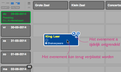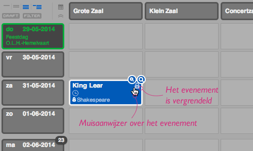 Evenementen die een status hebben van het type “Locked” verschijnen met een grijs slotje. In de kalender zal dit slotje verschijnen als je met de muisaanwijzer over het desbetreffende evenement beweegt. In het infovenster van het evenement verschijnt het slotje naast de naam, datum en locatie. Deze slotjes verschijnen ook in de boomweergaves van evenementgroepen.