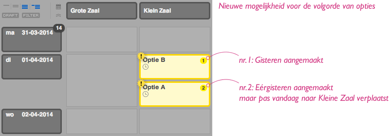 In de huidige situatie zal optie A vóór optie B komen in de Kleine Zaal. Met de nieuwe mogelijkheid zal optie A ná optie B komen in de Kleine Zaal. Deze is immers later dan optie B in de zaal geboekt.