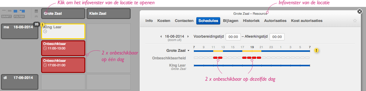 Bovendien zie je in de kalender nu ook de tijden waarop een locatie onbeschikbaar is. Indien de locatie meerdere niet-aaneensluitende periodes onbeschikbaar is, dan wordt dit nu ook netjes getoond.