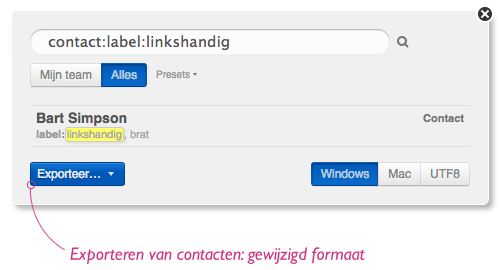 Na het uitvoeren van een zoekopdracht kan je de resultaten exporteren. Het formaat van het CSV-bestand dat geëxporteerd wordt voor contacten is aangepast. Dit volgt voortaan hetzelfde formaat als dat voor het importeren van contacten. Het importeren van contacten is voorbehouden voor beheerders.