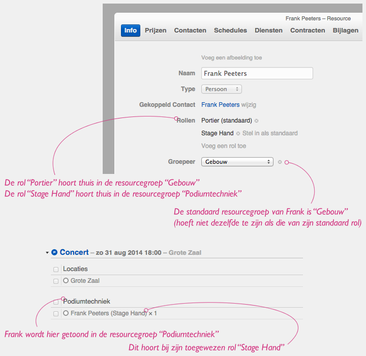 Geboekte medewerkers (human resources) verschijnen nu in het infovenster van het evenement bij de resourcegroep die hoort bij de toegekende rol van die medewerker, en niet langer steeds bij de resourcegroep die hoort bij de medewerker zelf.