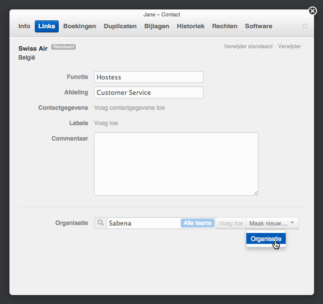 Het toevoegen van contactlinks op het “Links” tabblad van het infovenster van een contact is verbeterd. Voortaan kan je hier gebruik maken van het vertrouwde uitgebreide invulveld dat we kennen van de custom data. Het laat ook toe om meteen vanaf dit tabblad een nieuwe persoon of organisatie aan te maken mocht die nog niet bestaan.
