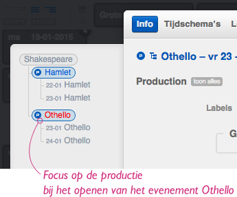 Het huidige gedrag is het volgende: bij het openen van het infovenster van een evenement dat tot een productie behoort, vanuit de kalender, ligt de focus op de productie. Je kan dan in het infovenster manueel de focus verleggen naar het evenement, indien gewenst, maar standaard opent het infovenster dus met de productie geselecteerd. Dit wil zeggen dat de waardes die je op het niveau van de productie invult (zoals bijvoorbeeld het aanvangsuur), zullen gelden voor álle evenementen die eronder vallen.