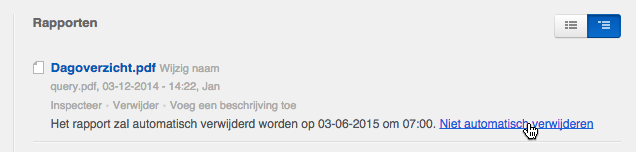 Indien je een bepaald rapport wenst bij te houden voor onbepaalde duur, dan kan je dit per rapport aangeven. Dit doe je door te klikken op “Niet automatisch verwijderen”.