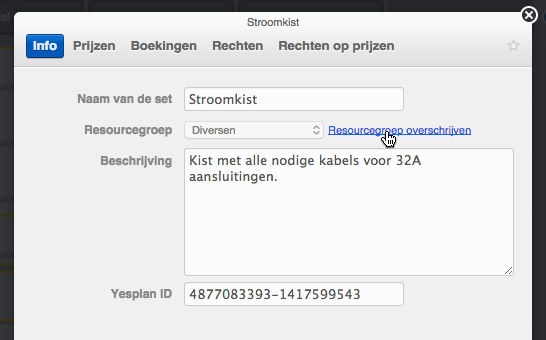Op het “Info” tabblad kan je nu bovendien ook een beschrijving toevoegen aan de resourceset, en je vindt er de Yesplan ID.