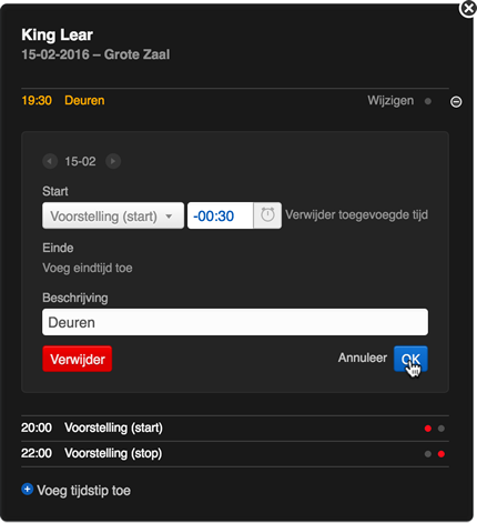 Je kan de uren van het tijdschema van evenementen als absolute tijden invoeren (bijv. voorstelling van 20:00 tot 22:00 of afbouw om 22:30 uur). Indien de voorstelling plots langer blijkt te duren, of vroeger zou beginnen, dan dien je ook een pak andere tijden aan te passen naar deze nieuwe situatie.