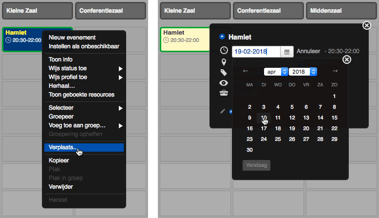 In de kalender kan je ook gebruik maken van de actie “Verplaats” uit het contextmenu om snel de datum of de locatie aan te passen in het detailvenster.